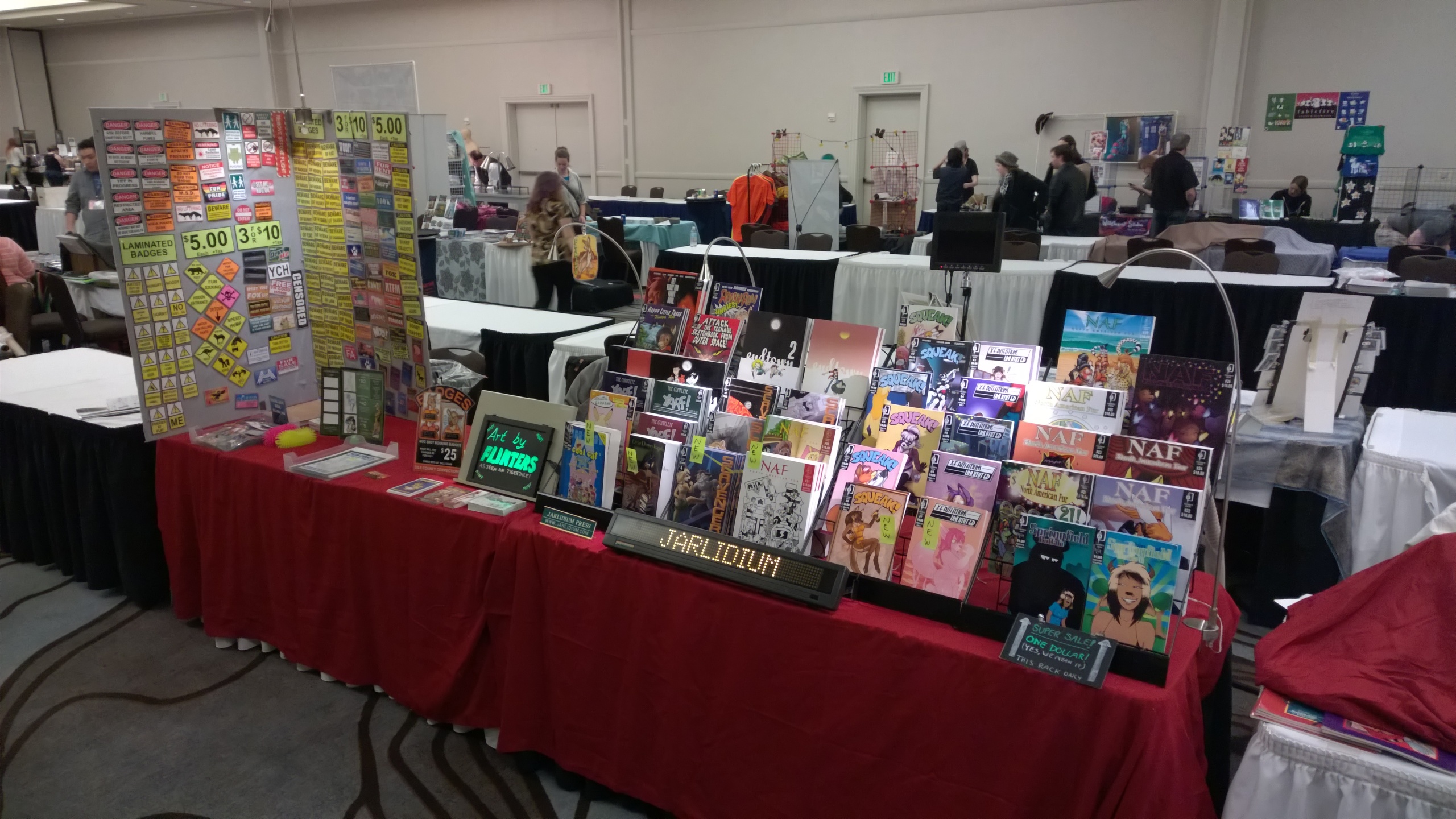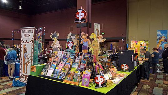 Hard to believe we've been doing this for more than 25 years, but I have a book with the Jarlidium name on it dated late 1998. A lot has changed since then! We started with fanzines printed on a photocopier, and now we're publishing full-color perfect-bound paperback books. Jarlidium Press consists of James "Tibo" Birdsall and Dan "Flinters" Canaan, and its history starts in the mid-90's, when Dan was doing fanzine publishing with the Unigraphix crew. He ended up on the west coast, separated from the rest of Unigraphix by the width of a continent, at about the same time that improved consumer-level color printing technology was eating away at Unigraphix's main business, which was doing fancy dye-sub color prints for various artists. The fanzine business was still going strong, so when Unigraphix proper folded, Dan had no reason to stop. James, who was stunned by the revelation that just anybody could publish a fanzine, was already starting to get into the act. Then we saw an ad for a secondhand Xerox copier... With the printing now literally in-house, our activity increased, and when we took over the monthly Dallas Brawl Update, the Jarlidium Press marque was born. Eventually, Xerox dropped support for our original copier and we leased a more recent unit, then moved over to a Canon digital copier. Since the Canon was both a high-speed sheet-fed scanner and a network printer as well as a copier, it gave us our first taste of doing production on the computer — we could scan the incoming art, do all the touchup and layout electronically, and then print the final product directly from the files. The rise of print-on-demand services on the Internet completed Jarlidium's transition to the purely electronic. When the lease for the Canon was up, we returned it and did not get a replacement. We can get a better product — professionally-printed paperback books and comics — by letting the specialists handle that part, and with the disappearance of homemade fanzines from the fandom, professional printing is what buyers expect these days. What's a fanzine? Back before the rise of big Internet art archives, the only way for art to get from artist to audience was on paper. There were professional publications, comics such as Furrlough or Genus or Zu or Critters, where the artist got paid, and then there were fanzines, where the artist didn't get paid but did get copies of the publication. Fanzines were generally digest sized, 5.5" by 8.5", the size you get if you fold a standard piece of copier paper in half, and were printed on copiers at the publisher's local copy shop. Some of the fancier ones were 8.5" by 11" and had colored cardstock covers. Fanzines used to be the mainstay of the fandom, and at their height there were several dozen active titles.