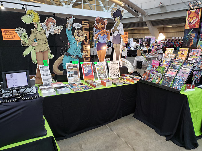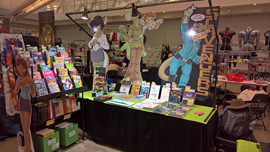 Hard to believe we've been doing this for more than 25 years, but I have a book with the Jarlidium name on it dated late 1998. A lot has changed since then! We started with fanzines printed on a photocopier, and now we're publishing full-color perfect-bound paperback books. Jarlidium Press consists of James "Tibo" Birdsall and Dan "Flinters" Canaan, and its history starts in the mid-90's, when Dan was doing fanzine publishing with the Unigraphix crew. He ended up on the west coast, separated from the rest of Unigraphix by the width of a continent, at about the same time that improved consumer-level color printing technology was eating away at Unigraphix's main business, which was doing fancy dye-sub color prints for various artists. The fanzine business was still going strong, so when Unigraphix proper folded, Dan had no reason to stop. James, who was stunned by the revelation that just anybody could publish a fanzine, was already starting to get into the act. Then we saw an ad for a secondhand Xerox copier... With the printing now literally in-house, our activity increased, and when we took over the monthly Dallas Brawl Update, the Jarlidium Press marque was born. Eventually, Xerox dropped support for our original copier and we leased a more recent unit, then moved over to a Canon digital copier. Since the Canon was both a high-speed sheet-fed scanner and a network printer as well as a copier, it gave us our first taste of doing production on the computer — we could scan the incoming art, do all the touchup and layout electronically, and then print the final product directly from the files. The rise of print-on-demand services on the Internet completed Jarlidium's transition to the purely electronic. When the lease for the Canon was up, we returned it and did not get a replacement. We can get a better product — professionally-printed paperback books and comics — by letting the specialists handle that part, and with the disappearance of homemade fanzines from the fandom, professional printing is what buyers expect these days. What's a fanzine? Back before the rise of big Internet art archives, the only way for art to get from artist to audience was on paper. There were professional publications, comics such as Furrlough or Genus or Zu or Critters, where the artist got paid, and then there were fanzines, where the artist didn't get paid but did get copies of the publication. Fanzines were generally digest sized, 5.5" by 8.5", the size you get if you fold a standard piece of copier paper in half, and were printed on copiers at the publisher's local copy shop. Some of the fancier ones were 8.5" by 11" and had colored cardstock covers. Fanzines used to be the mainstay of the fandom, and at their height there were several dozen active titles.